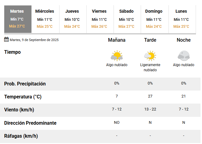 PRONÓSTICO Vuelve el calor a San Juan: empieza una seguidilla de días con temperaturas altas Escrito por Redacción 4DIARIO septiembre 9, 2025 La máxima de este martes llegará a 27 grados. Noticias recientes Ahora se puede planear el viaje con Red Tulum a través de Google Maps: cómo usarlo Caucete: robaron membrana en una finca y la desecharon en techos de otras casas Otro complicación para Chiqui Tapia: denunciaron a la AFA por presunta apropiación indebida de tributos