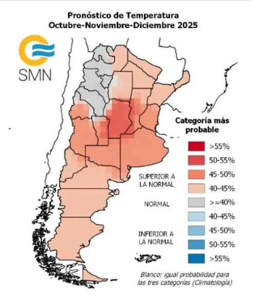 En tanto, el noreste y la Patagonia también presentarán un escenario cálido, aunque con menor intensidad: el SMN estima un 45% de chances de que las temperaturas se ubiquen por encima de lo normal.