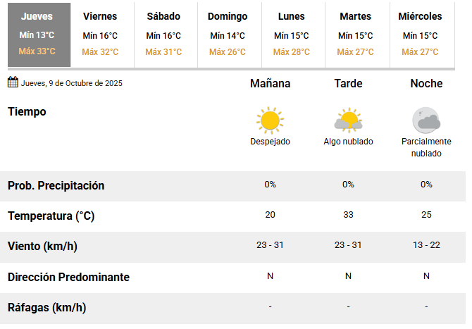 PRONÓSTICO Tiempo en San Juan: jueves muy caluroso según el pronóstico Escrito por Redacción 4DIARIO octubre 9, 2025 La máxima llegará a los 33 grados por la tarde. Noticias recientes Dos niños resultaron hospitalizados tras un choque en Circunvalación Preocupación en la Comunidad Fuego: cada vez más consultas por adicciones El dólar oficial cayó $75 y cerró a $1.375