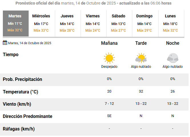 PRONÓSTICO Tiempo en San Juan: pronóstico de este martes 14 de octubre Escrito por Redacción 4DIARIO octubre 14, 2025 La máxima llegará a los 32 grados. Noticias recientes Los vecinos del barrio Valle Grande harán una manifestación tras el crimen de Emir Barboza Desde el Gobierno Nacional adelantan que, además del apoyo financiero, habrá un acuerdo comercial inédito con EE.UU. El Gobierno oficializó, en el Boletín Oficial, el RIGI del proyecto Los Azules