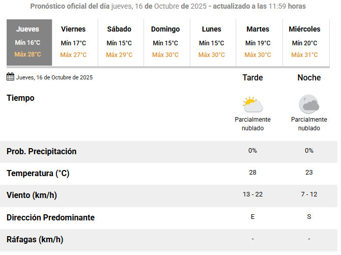 PRONÓSTICO Tiempo en San Juan: pronóstico de este jueves 16 de octubre Escrito por Redacción 4DIARIO octubre 16, 2025 La máxima será de 28 grados. Noticias recientes Milei confirmó que Argentina negocia con Francia la compra de submarinos y buques de patrullaje A poco de las vacaciones, ¿qué pasajes tienen más demanda en la Terminal?: precios y promociones Extendieron el alerta amarilla por tormentas a este viernes en San Juan