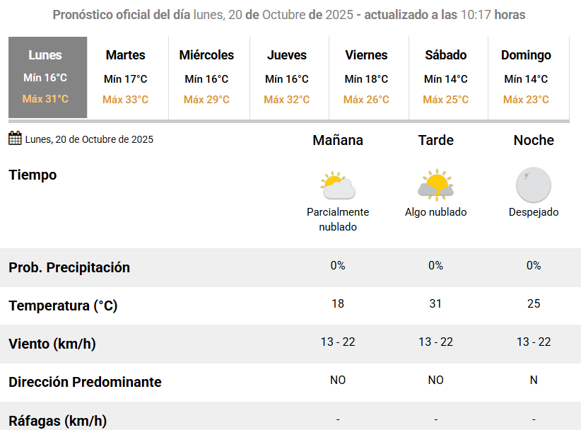 De acuerdo con el Servicio Meteorológico Nacional (SMN), este lunes 20 de octubre San Juan tendrá una jornada cálida y mayormente despejada.