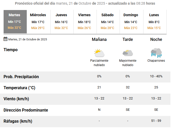 Según el Servicio Meteorológico Nacional (SMN), este martes 21 de octubre se espera en San Juan una jornada calurosa e inestable, con una temperatura máxima de 32°C y una mínima de 17°C.