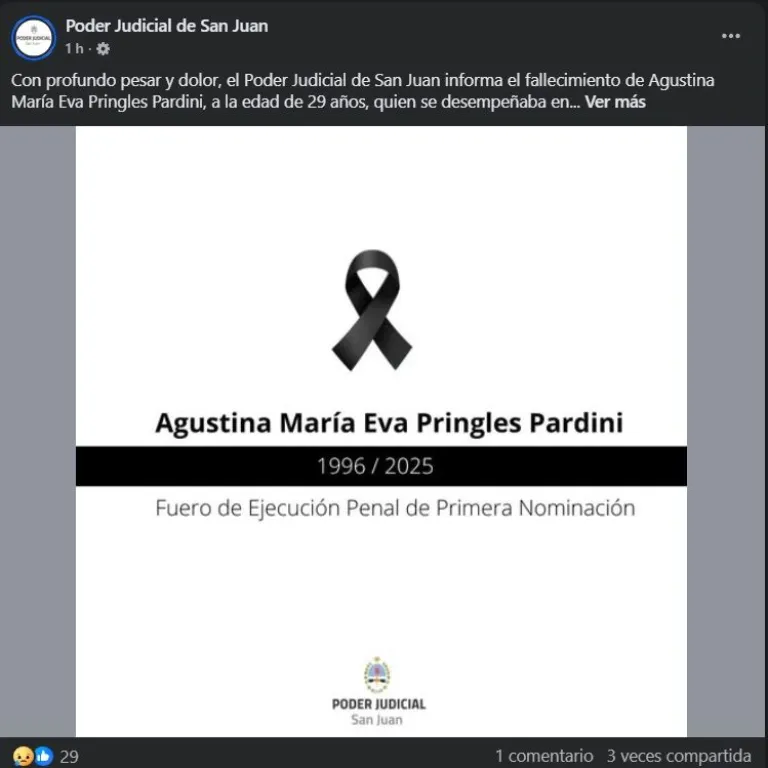 En horas de la mañana de este lunes se conoció una triste noticia que enluta al Poder Judicial de San Juan: el fallecimiento de Agustina María Eva Pringles Pardini, una joven empleada de 29 años. La información fue confirmada a través de las redes oficiales de la institución.