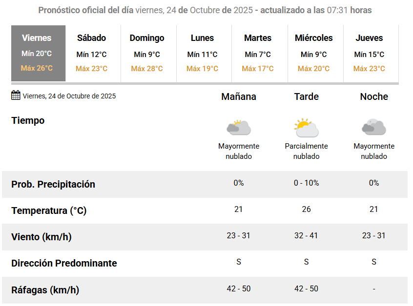 PRONÓSTICO Tiempo en San Juan: pronóstico de este viernes 24 de octubre Escrito por Redacción 4DIARIO octubre 24, 2025 La máxima desciende y no superará los 26°C, según el Servicio Meteorológico Nacional. Noticias recientes Más seguridad para la comunidad educativa: 9 de Julio inauguró dársenas y paradas de colectivo frente a un colegio en la Ruta N°20 El dólar oficial bajó por cuarta jornada y el mercado mostró estabilidad cambiaria Llegaron las lluvias a Jáchal y Barreal tras el aviso del Servicio Meteorológico Nacional