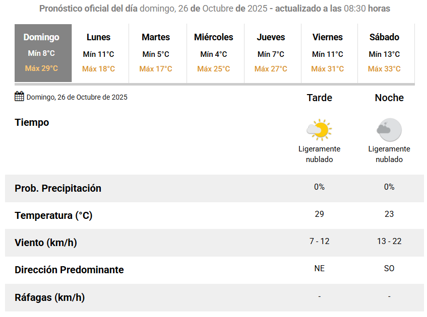PRONÓSTICO Tiempo en San Juan: pronóstico de este domingo 26 de octubre Escrito por Redacción 4DIARIO octubre 26, 2025 La máxima no superará los 29 grados. Noticias recientes Milei confirmó que Argentina negocia con Francia la compra de submarinos y buques de patrullaje A poco de las vacaciones, ¿qué pasajes tienen más demanda en la Terminal?: precios y promociones Extendieron el alerta amarilla por tormentas a este viernes en San Juan
