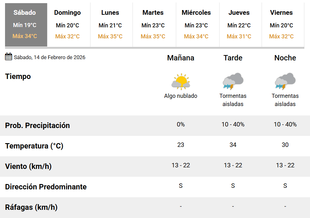Por la tarde y noche, el cielo permanecerá parcialmente nublado, con una probabilidad de 40% de tormentas aisladas.