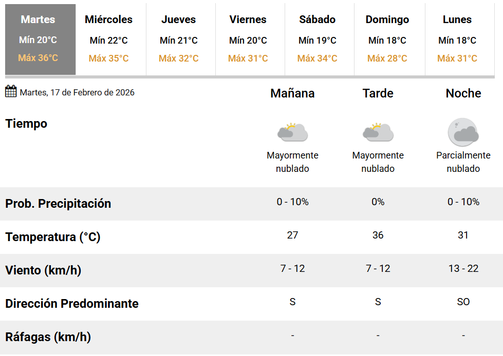 PRONÓSTICO Tiempo en San Juan: pronóstico de este martes 17 de febrero Escrito por Redacción 4DIARIO febrero 17, 2026 La máxima llegará a los 36 grados. El cielo permanecerá entre parcial y mayormente nublado. Noticias recientes Importante movimiento turístico en el primer feriado largo de 2026: viajaron 3 millones de personas Chimbas cerró su tradicional Carnaval con más de 100 mil asistentes entre las tres noches Orrego destacó como «un paso histórico» el plan de inversiones anunciado por Vicuña