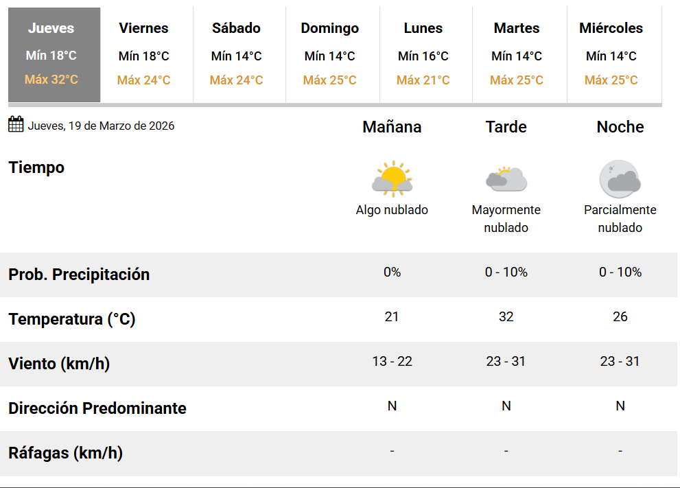 Durante la mañana, se espera un cielo con nubosidad variable y viento proveniente del sector norte, con velocidades estimadas entre 13 y 22 km/h.