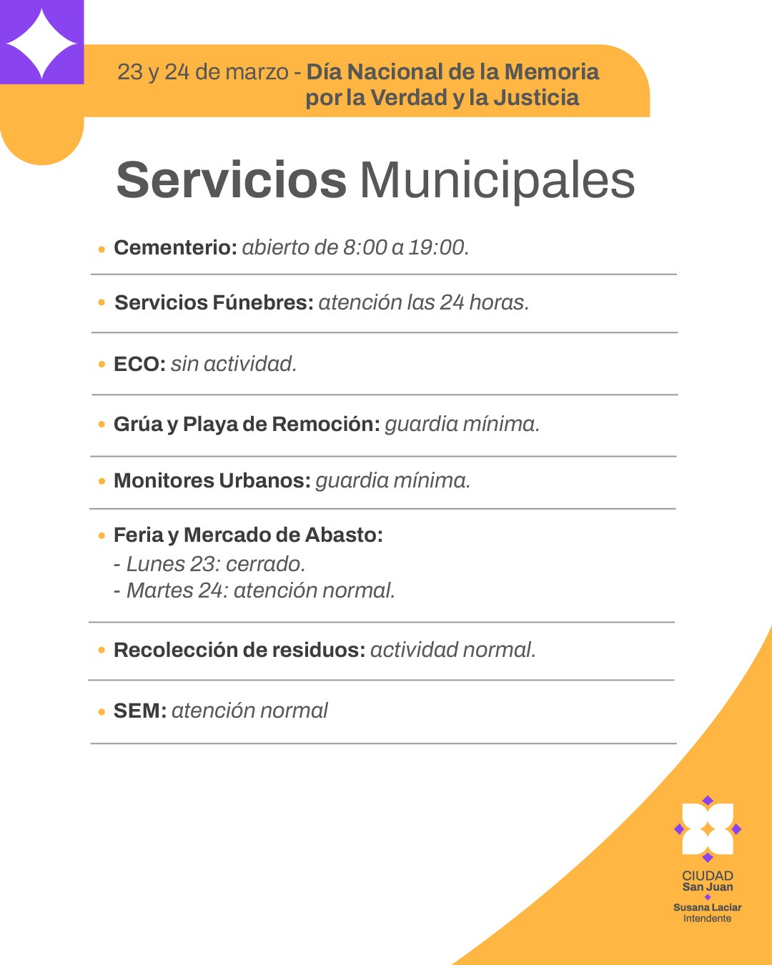 La Municipalidad de la Ciudad de San Juan comunicó el esquema de funcionamiento de sus servicios durante este lunes 23 y martes 24. En ambas jornadas, «se mantendrán operativas las áreas esenciales, reafirmando el compromiso de no descuidar la atención y el acompañamiento a los vecinos», afirmaron desde la comuna.