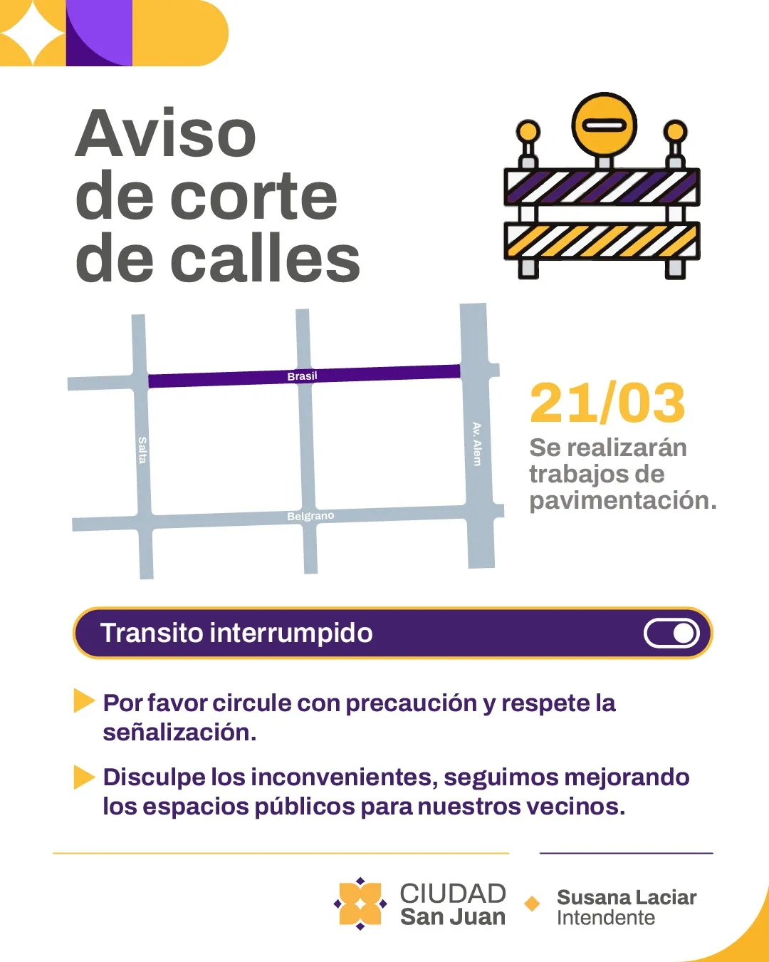 Continúan las obras de pavimentación en distintos departamentos de la provincia de San Juan. Este sábado, la Municipalidad de la Ciudad de San Juan informó que los trabajos estarán concentrados en la calle Brasil, en el tramo comprendido entre Avenida Alem y Salta.