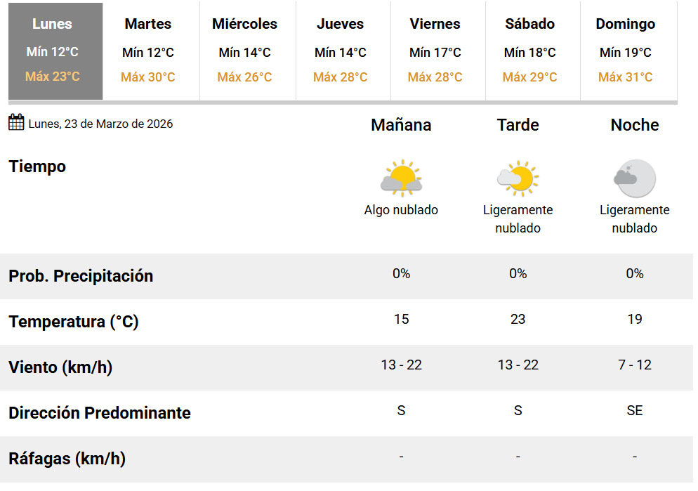 Para este lunes 23 de marzo, el pronóstico anticipa un día con nubosidad variable, sin probabilidades de precipitaciones. Durante la mañana, el cielo se presentará algo nublado, mientras que hacia la tarde y la noche se mantendrán condiciones similares, con presencia de nubes pero sin cambios significativos.