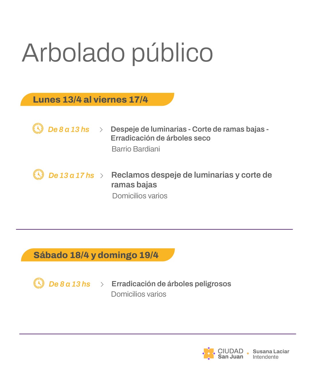 La Municipalidad de la Ciudad de San Juan informa el cronograma de trabajos de arbolado público que se llevará adelante desde el lunes 13 hasta el domingo 19 de abril, con intervenciones programadas tanto en barrios como en domicilios particulares.