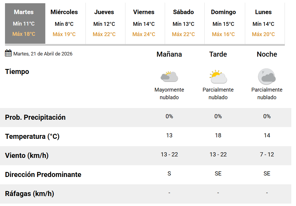 Hacia la noche, la temperatura descenderá a unos 14°C, mientras el cielo continuará parcialmente nublado. El viento rotará al sudeste, con intensidades de entre 13 y 22 km/h, disminuyendo luego a valores de entre 7 y 12 km/h.
